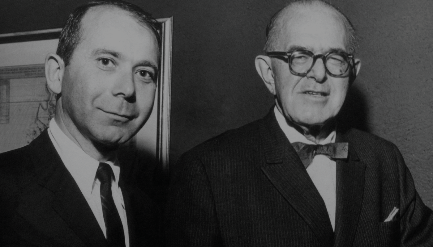 Maurice R. Greenberg, presidente da American Home Assurance Company (à esquerda) e Cornelius V. Starr, fundador da Starr, comemoram o 75º aniversário do Sr. Starr em outubro de 1967.